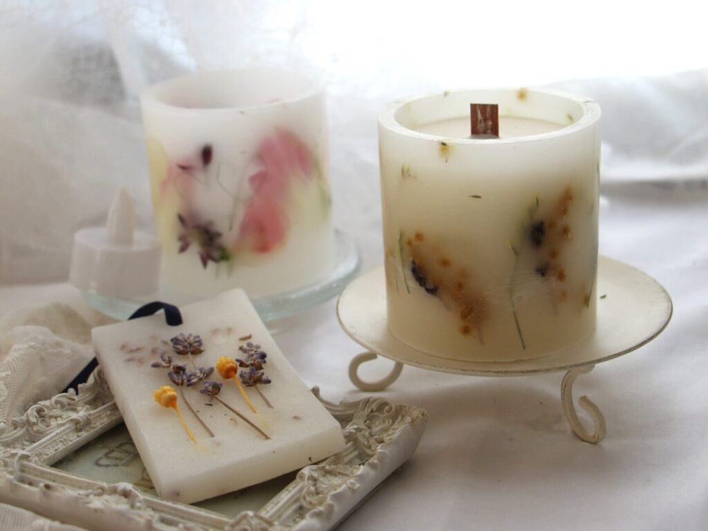 植物を入れたボタニカルキャンドルとインテリアとして飾っていただく香りをつけたアロマワックスサシェです。
